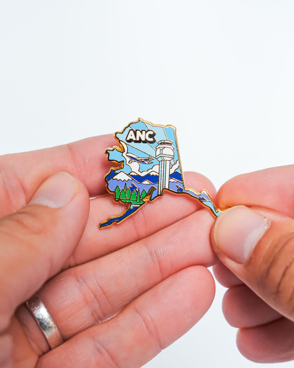 Every pin includes a custom backing card and magnetic adapters, allowing it to be displayed as an airport magnet or worn proudly.