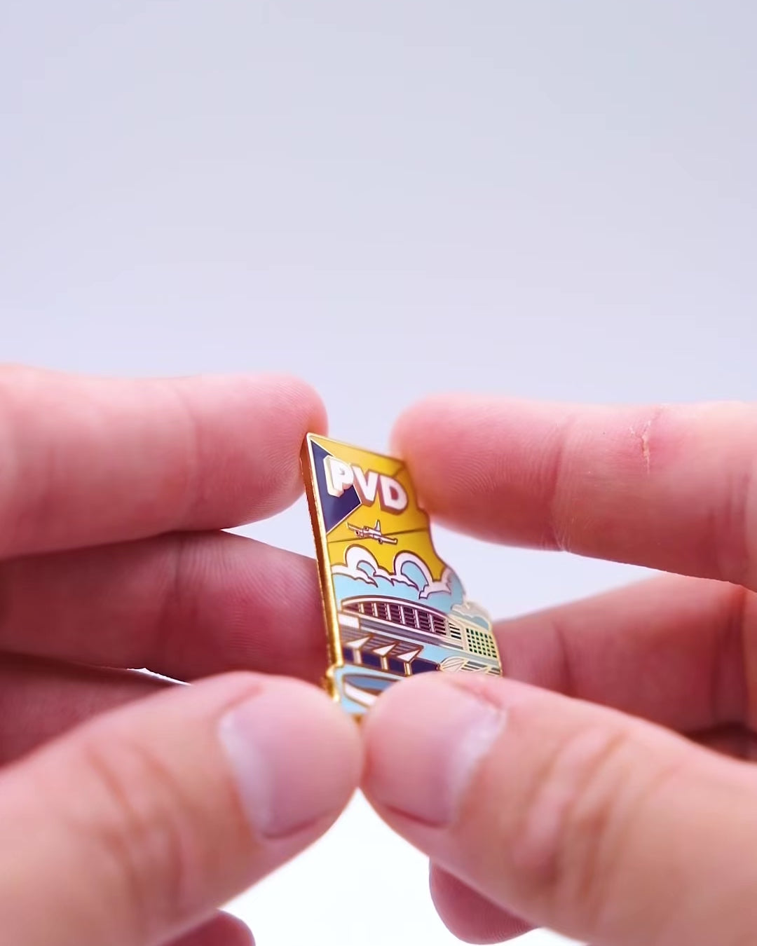 This enamel Airport Pin celebrates Rhode Island T. F. Green International Airport (PVD), the primary airport serving the Providence metropolitan area and connecting travelers to destinations across the United States and internationally. Designed in the shape of the state of Rhode Island, this pin is crafted in high-quality hard enamel, offering a smooth surface, flat finish, and exceptional durability.