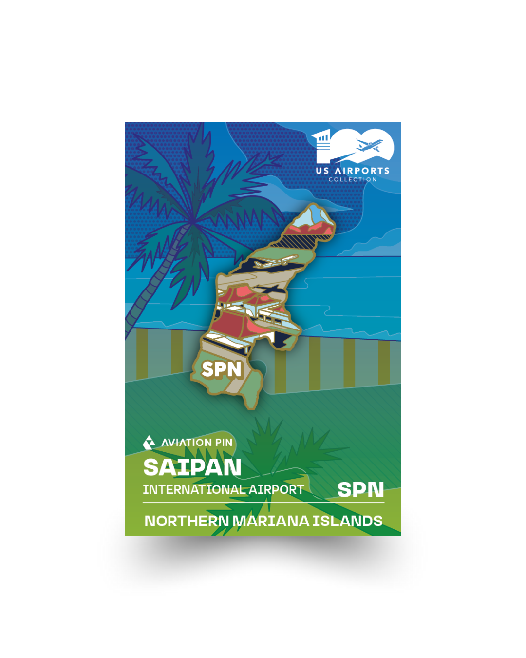 Every pin includes a custom backing card and magnetic adapters, allowing it to be displayed as an airport magnet or worn proudly.