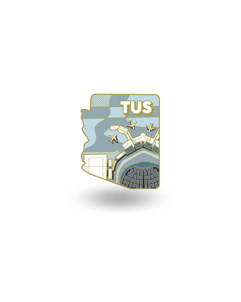 Discover the 100 US Airports Collection, a complete series of enamel pins celebrating the airports of the United States. Each pin is crafted in gold metal, shaped after the state where the airport is located, and designed with real architectural details and its airport code.